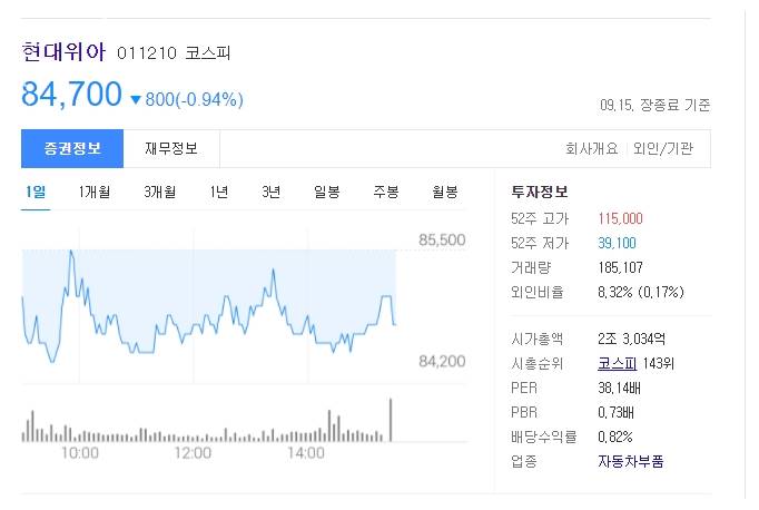 마지막으로 차트 흐름 알아보도록 하겠습니다. 현대위아는 전일대비 0.94% 하락한 84,700원에 종가마감했습니다. 52주 고가는 115,000원이었으며 52주 저가는 39,100원이었습니다. 시가총액은 2조 3034억원으로서 코스피 143위에 해당하는 기업입니다.