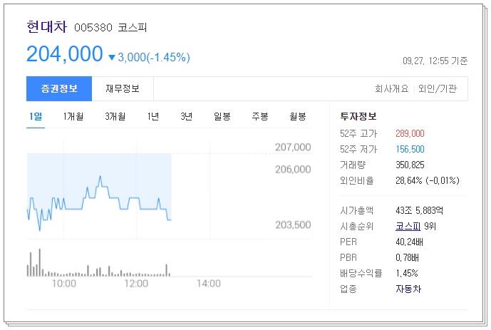 차트를 살펴보면 지루한 횡보장이 꽤 길어지고 있음을 알 수 있습니다. 현재 증권가에서는 현대차 목표 주가를 29~35만원 선으로 잡고 있습니다. 오늘은 전일대비 1.45% 하락한 204,000원에 거래되고 있습니다. 52주 고가는 289,000원이었으며 52주 저가는 156,500원이었습니다.