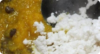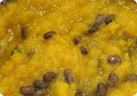 이제 냄비에 남아있는 호박에 좀 전에 삶았던 돔부콩이나 팥을 넣어주면 됩니다. 으깬 호박과 함께 고루고루 잘 섞어주면서 중간중간 간을 봐서 싱겁다면 소금간을 이때 해주면 됩니다.
