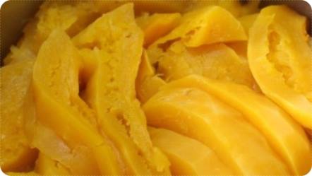 호박을 깨끗하게 깎았다면 이제 호박을 잘라주면 됩니다. 다만 호박이 워낙 단단해서 칼 잘못들면 손을 벨 수 있으므로 이 점 주의해주시기 바랍니다.