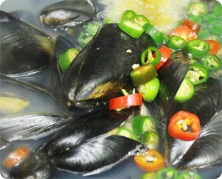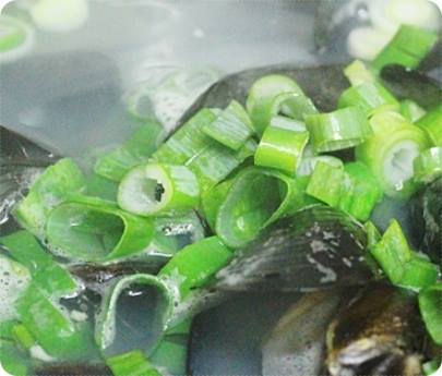 다진마늘 및 청양고추까지 모두 다 넣었다면 이제 대파로 마무리해주면 됩니다. 대파까지 다 넣은 뒤 간을 보면서 간이 부족하면 소금을 살짝 넣어주도록 합니다. 이미 바다에서 건진 홍합에 간이 잘 되어 있으나 싱겁게 느껴지면 소금으로 마무리해주면 됩니다.
