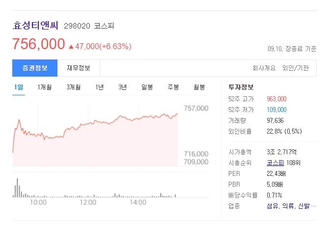 마지막으로 효성티앤씨 주가 전망 차트 살펴보도록 하겠습니다. 효성티앤씨는 전일대비 무려 6.63%나 상승한 756,000원에 종가마감했습니다. 52주 고가는 963,000원이었으며 52주 저가는 109,000원이었습니다.