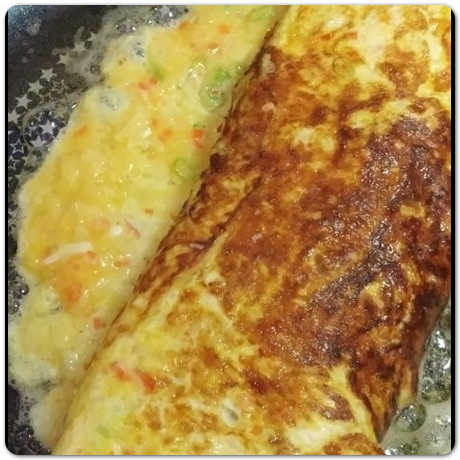 기름 두르고 난 뒤, 후라이팬에 계란물+야채를 최대한 얇게 펼쳐주도록 합니다. 계란말이는 돌돌 말아야 하므로 두껍게 펼쳐지면 잘 말아지지 않습니다. 그래서 최대한 얇게 얇게 펼치면서 후라이팬 안을 전체 채워주면 됩니다.