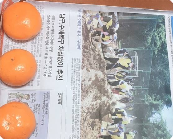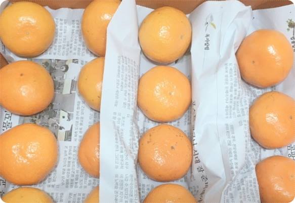 tip) 귤 보관법 신문지를 깔고 그 위에 귤을 한꺼번에 많이 놓는 것이 아니라 제일 밑바닥에 신문지를 깔았다면 귤은 3~4개만 올려줍니다. 그리고 그 위에 신문지를 올려주는데 좀 전에 있었던 귤 바로 옆에 3~4개를 또 놔두는 겁니다.
