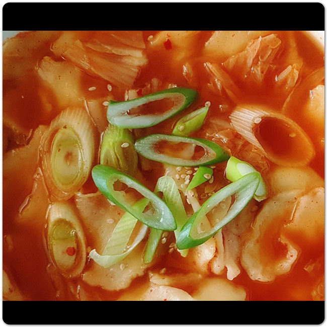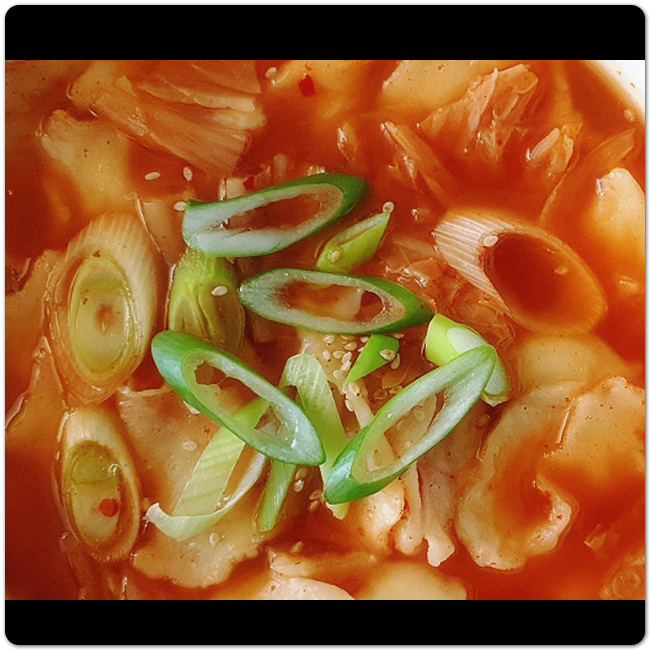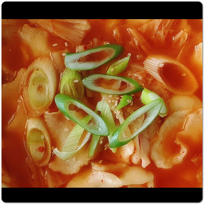이제, 김치 수제비가 어느 정도 익어가기 시작하면 대파를 송송 썰도록 합니다. 미리 얼려놓은 대파가 있으면 이때 꺼내면 됩니다. 이렇게 준비한 대파를 끓고 있는 김치수제비에 살짝 넣으면 얼큰하고 맛있는 국물요리가 완성됩니다. 대파 또한, 너무 오랫동안 끓이면 흐물흐물해지므로 제일 마지막에 넣고 1분 정도만 더 끓인 뒤 바로 불 끄면 됩니다.