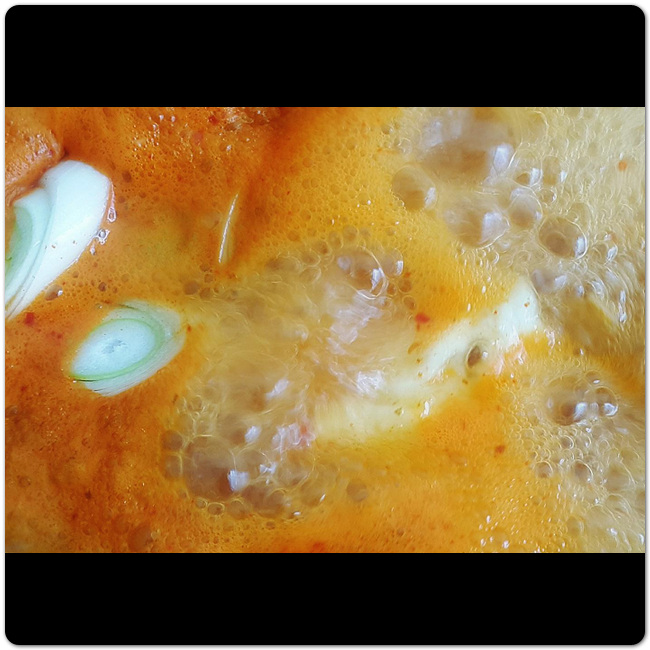 이렇게 김치를 넣고난 뒤, 김치가 어느 정도 익었으면 냉장고에서 숙성시킨 반죽을 얇게 떼내어 툭툭 투하한 다음 3~4분 정도 더 끓여주면 됩니다. 너무 큼직큼직하게 떼내는 것보다 어느정도 먹기 좋은 크기로 툭툭 투하해야 먹을 때도 좋고 보기에도 좋습니다.