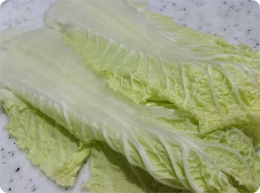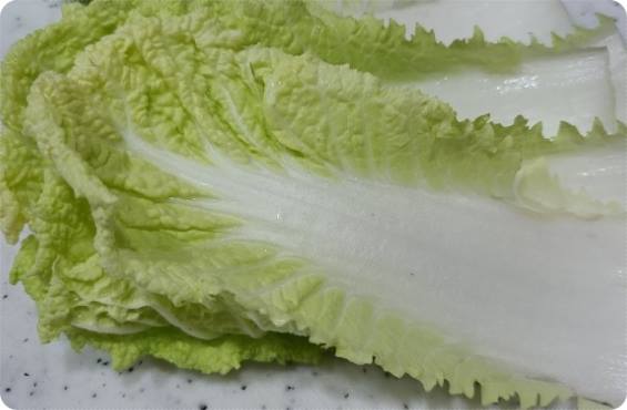 다섯번째 단계는 배추를 씻어준 뒤 뒷면을 으깨주는 작업입니다. 배추를 보면 동그랗게 말리는 모양새를 띄고 있어서 그 상태로 부침을 하면 반죽이 제대로 묻지 않습니다.