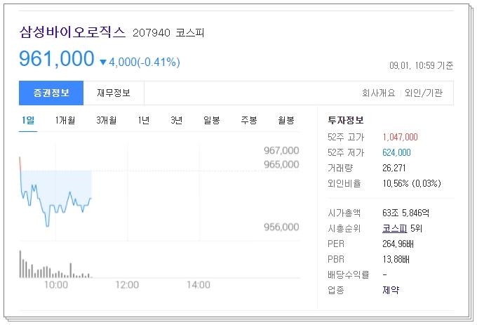 아마도 3분기 영업매출이익이 2분기를 능가하게 된다면 동사의 시총액도 상승하게 됩니다. 현재 동사의 외국인 비율은 10.56% 정도 차지하고 있으며 시가총액은 63조 5184억입니다. 또한, 코스피로는 현재 5위의 시총 순위를 차지하고 있습니다. 이상 삼성바이오로직스 주가 전망이었습니다.