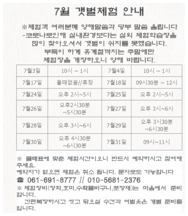 마지막은 여수갯벌 노을마을입니다. 위치는 여수시 소라면 서부로 785-24에 있습니다. 이곳은 갯벌 체험을 할 수 있는 곳으로 미리 예약을 하고 가야만 체험활동 할 수 있습니다. 인터넷에 여수갯벌노을마을이라고 친 후 사이트에 들어가면 들어가서 예약하면 됩니다. 할 수 있는 시간대 및 해당 날짜가 다 나와있기 때문에 미리 예약 후 체험하면 됩니다. 삼발이, 장화, 호미 등은 마을에서 다 줍니다. 그래서 아이들이 따로 가지고 놀 장난감만 챙겨가면 됩니다.