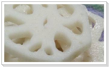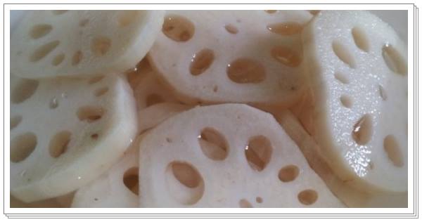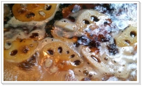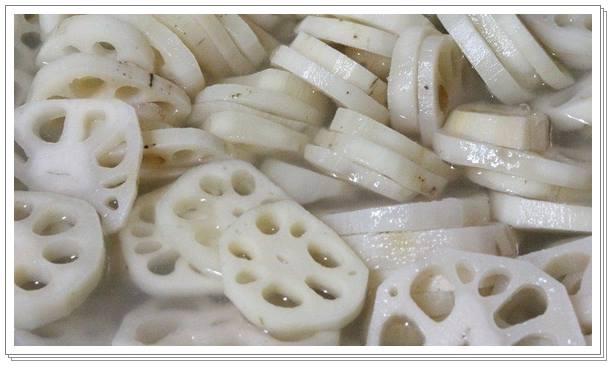 첫 번째 단계는 연근 세척하는 단계입니다. 먼저 연근 껍질의 흙을 털어낸 후, 껍질을 벗기고, 0.5~1cm 의 두께로 썰어주도록 합니다. 다 썰고난 뒤에는 대야에 썰어놓은 대야를 담아놓고 식초를 1~2방울 정도 떨어트린 후 5분 정도 담궈두도록 합니다. 물 넣어두는 양은 연근이 충분히 잠길정도면 됩니다. 이렇게 미리 작업을 하면 불순물도 빠져나갈뿐만 아니라 연근이 갈변하는 것도 방지해줍니다.