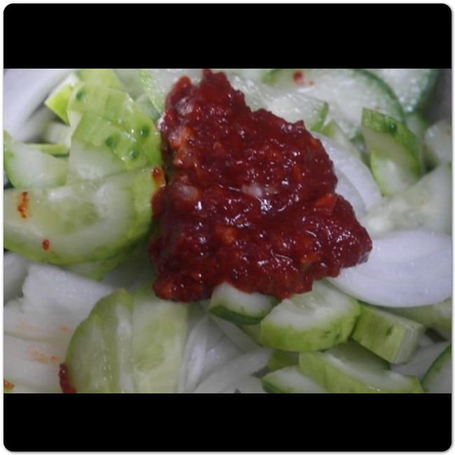 오이와 양파를 썰고나면 이제 양념장을 준비하도록 합니다. 양념장은 고춧가루 반스푼, 식초 2스푼, 고추장 한스푼, 소금 1스푼, 아가베시럽 두스푼, 다진마늘 한스푼입니다. 여기에서 아가베시럽은 설탕과 물엿을 동일한 양으로 맞춘 것을 의미합니다. 저는 설탕 2스푼, 물엿 2스푼 이 비율로 맞춰서 넣어줬습니다.