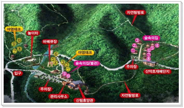 위 사진에서 숙박 요금도 참고해주시기 바랍니다. 휴양림 안에는 아이들이 놀만한 시설인 트팸플린 등도 조성되어 있고, 자연탐방로, 산약초 재배단지 등을 볼 수 있습니다.