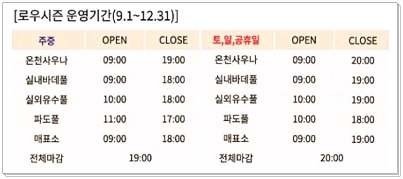 족욕장도 잘 조성되어 있으며 내부에는 수영장과 함께 온천 대욕장도 있으며 함께 사용 가능합니다. 운영시간은 아래 사진을 참고해주시기 바랍니다.