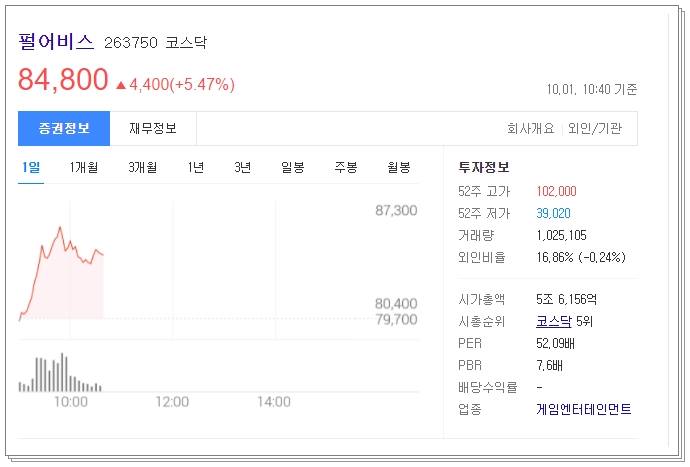 마지막으로 펄어비스 차트 살펴보겠습니다. 현재 전일 대비 5.97% 상승한 85,200원에 거래되고 있습니다. 52주 고가는 102,000원이었으며 52주 저가는 39,020원이었습니다. 현재 시가총액은 5조 6421억원으로 코스닥 5위에 해당합니다.