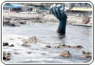 포항 호미곶하면 떠오르는 것이 바로 상생의 손입니다. 주로 바닷가에 놓여있는 상생의 손만 기억하지만 호미곶에 직접 가서 보면 육지에도 하나, 그리고 바다에도 하나 있으며 둘이 서로 마주보고 있는 걸 확인할 수 있습니다. 육지에 왼손, 포항 바다에 있는 게 오른손으로 둘 다 모두 양손이 하늘을 떠받치고 있는 형상입니다.